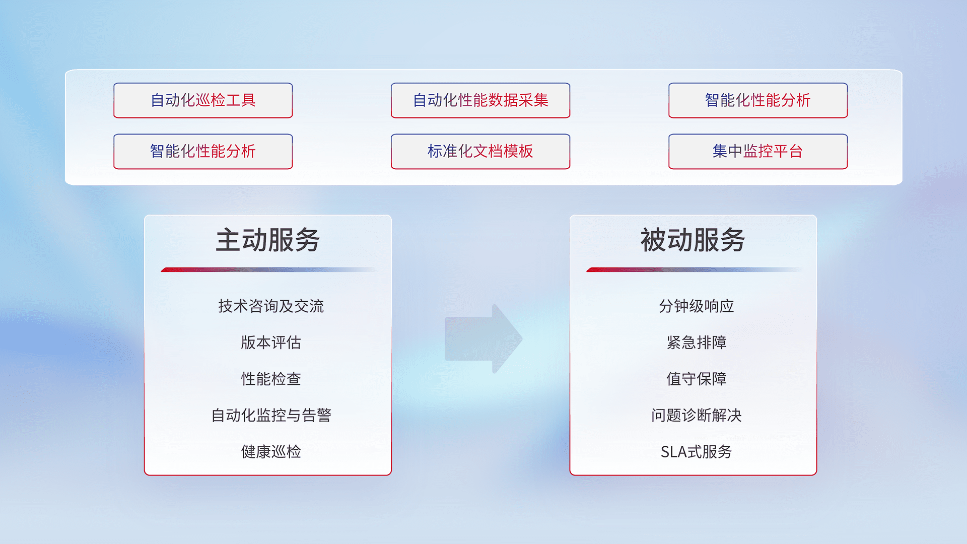智能化工具和标准化文档,,,,保障服务质量,,提供主动服务(包含技术咨询、、、版本评估、、、、性能检查、、、、自动化监控与告警、、、健康巡检)和被动服务包含(分钟级响应、、、、紧急排障、、、、值守保障、、、、问题诊断解决、、、SLA服务)。。。。